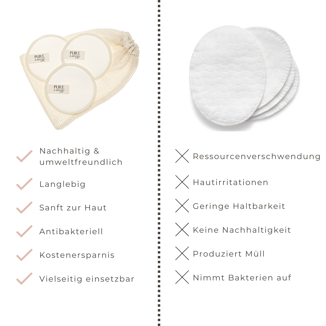 Bambus Kosmetikpads sind nachhaltig, weil Bambus eine schnell nachwachsende Pflanze ist, die biologisch abbaubar ist. Die wiederverwendbaren Pads ersetzen Einweg-Wattepads und reduzieren so den Müll. Die umweltschonende Herstellung benötigt weniger Energie und Chemikalien. Eine einfache und effektive Möglichkeit, unseren ökologischen Fußabdruck zu verringern.