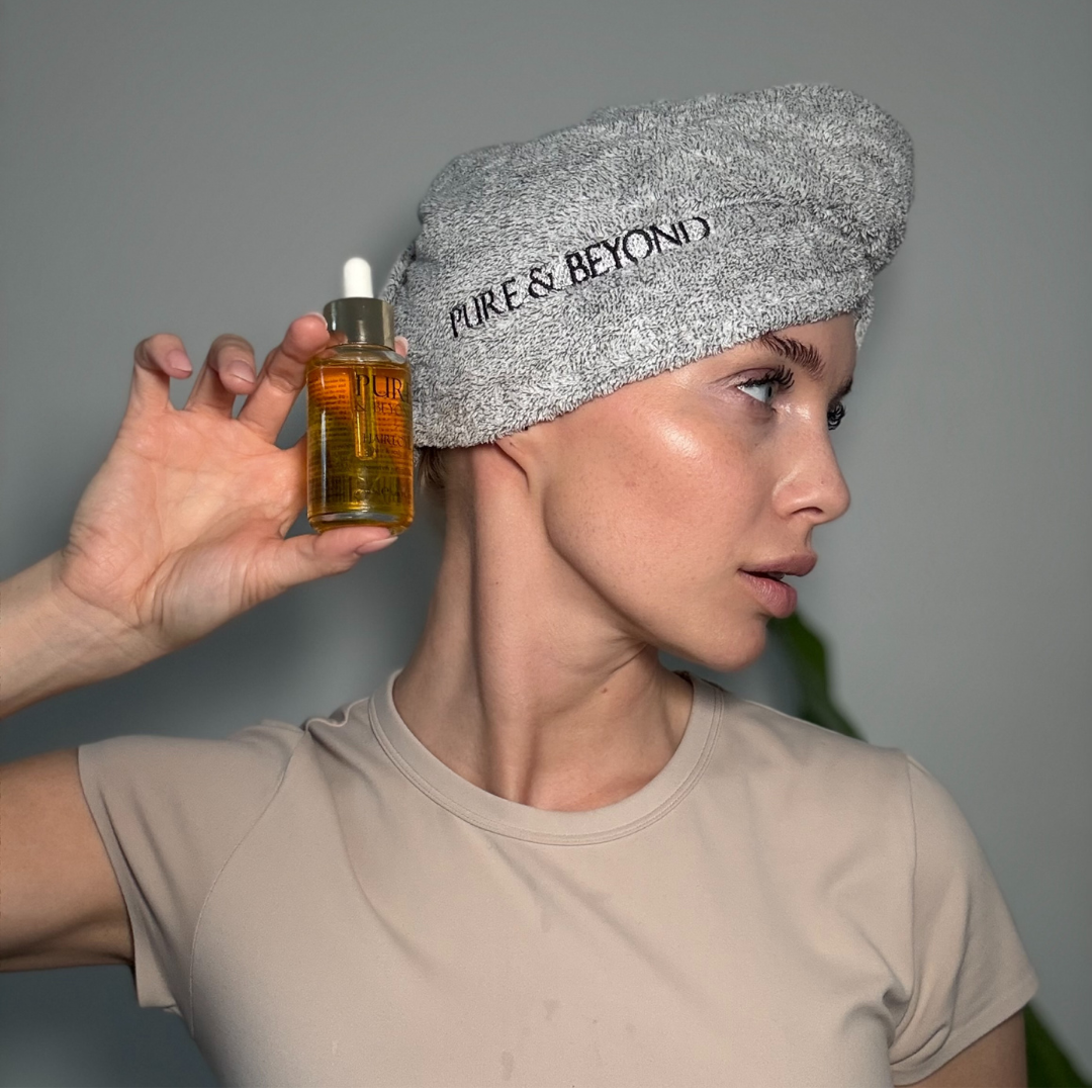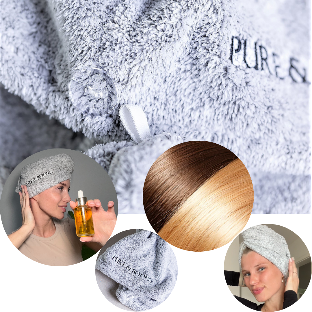 Der Turban fixiert das Haar schonend, reduziert Frizz und Haarbruch, und spart zusätzlich Föhnzeit. Dank seiner antibakteriellen und atmungsaktiven Eigenschaften bleibt er hygienisch, weich und langlebig.