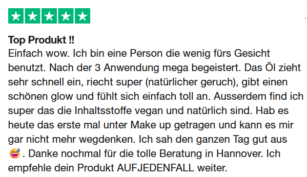 Also ich benutze es seit 12 Tagen den Gesichtsöl, ich kann erst mal nicht viel sagen werde bis zum Ende weiter benutzen.