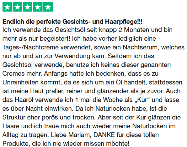 "Erstaunlich gute Pflege! Habe meine ölige Haut & schnell fettende Haare nun im Griff." - Pia